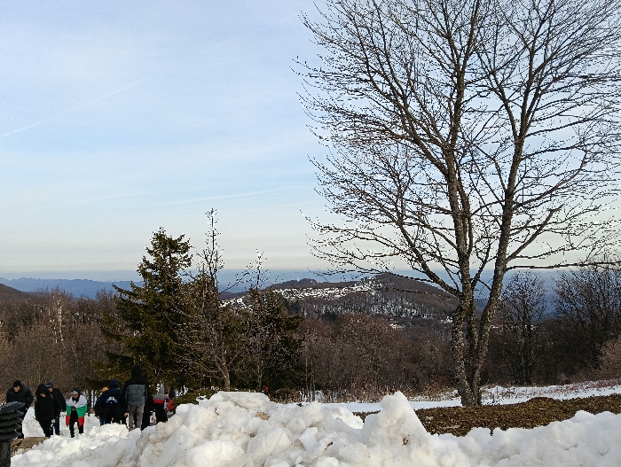 The image presents a winter landscape observed from a elevated position in the vicinity of Shipka, Bulgaria. The immediate foreground is dominated by a substantial, uneven mound of white snow, stretching horizontally across the lower frame. To the right of this snow, an area of exposed brown earth or dried vegetation is visible. In the lower-left mid-ground, a group of approximately eight to ten individuals is seen navigating a snow-covered path or slope. They are predominantly dressed in dark winter outerwear. One person exhibits a three-stripe pattern of white, green, and red, consistent with the Bulgarian flag, on a sleeve or back of their garment. The individuals appear to be walking away from the viewer, generally moving from left to right. The mid-ground features a prominent, large deciduous tree with multiple trunks and bare branches, positioned on the right side of the frame. To its left, and extending into the background, are numerous other bare deciduous trees and several dark green evergreen trees (conifers) interspersed on undulating terrain, some with visible patches of snow on the ground. The background reveals a panoramic vista of distant, snow-dusted mountains or hills under a light blue sky. A discernible cluster of small, light-colored structures, indicative of buildings, is visible on a prominent distant ridge or peak. A faint, thin white contrail is present in the upper-left quadrant of the sky.