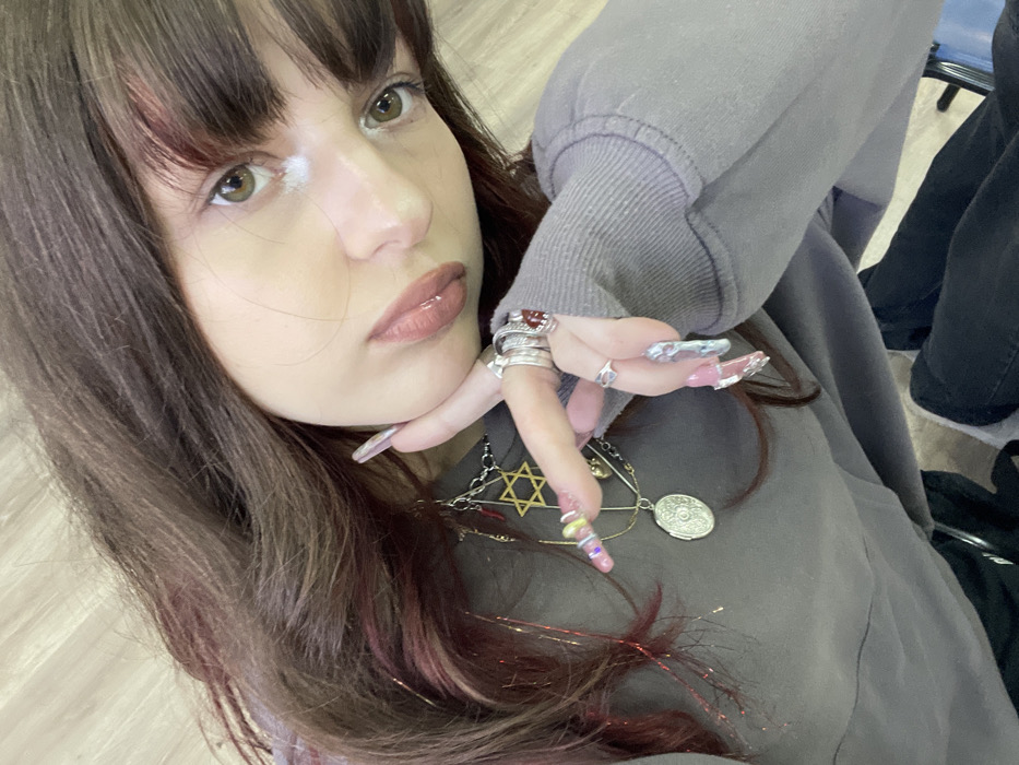 A close-up, high-angle portrait features a young female with long, dark brown hair, bangs, subtle reddish highlights, and decorative tinsel strands. She has light brown/hazel eyes with a white highlight near the inner corners and glossy, pink-toned lips. Her head is tilted slightly to the left, and her left hand is raised, with the index finger touching her chin. She wears a grey long-sleeved sweatshirt and dark trousers. Her fingers display multiple silver rings, including one with a red stone, and feature long, elaborately designed, multi-colored artificial nails. Layered necklaces are visible, including one with a gold Star of David pendant and another with a silver oval locket. The subject is positioned indoors, against a blurred background of a light-colored wooden or laminate floor. The scene is located in Raanana, Israel.