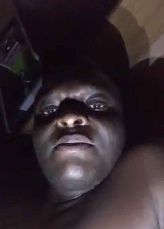 A man is seen from the chest up. He has dark skin and looks at the camera, speaking directly into it. The scene is very dark, but the man's face is visible. Some indistinct objects can be seen behind him, up and to the left.