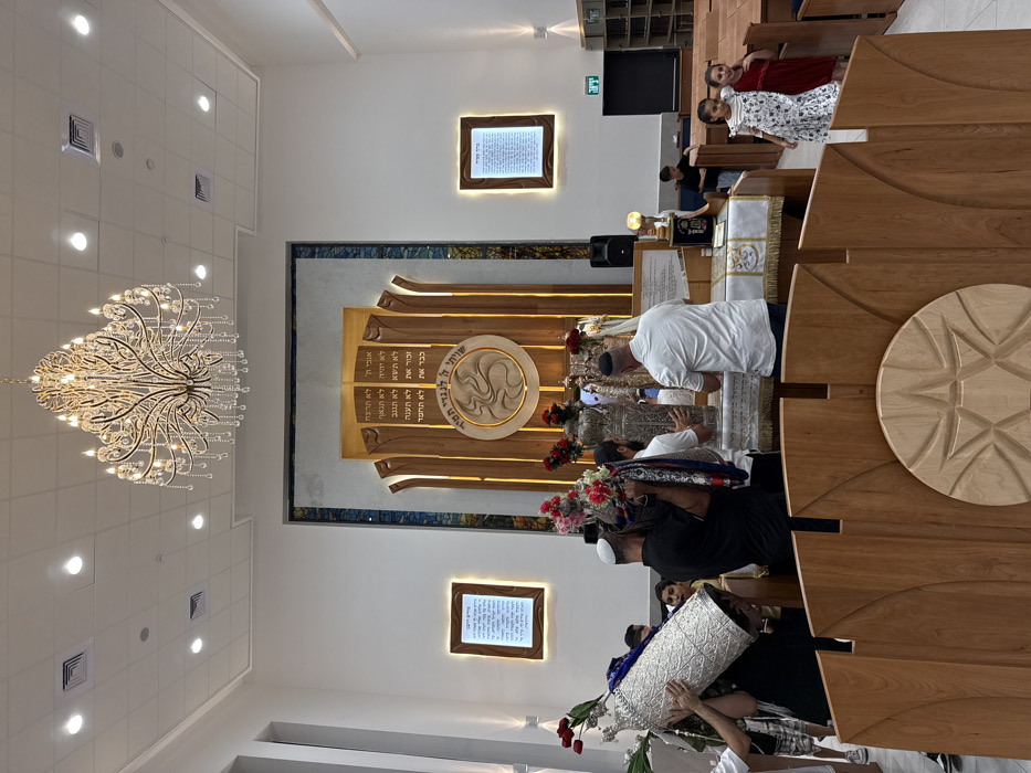 This image depicts the interior of a modern synagogue in Beer Yaaqov, Israel, during a religious ceremony involving Torah scrolls