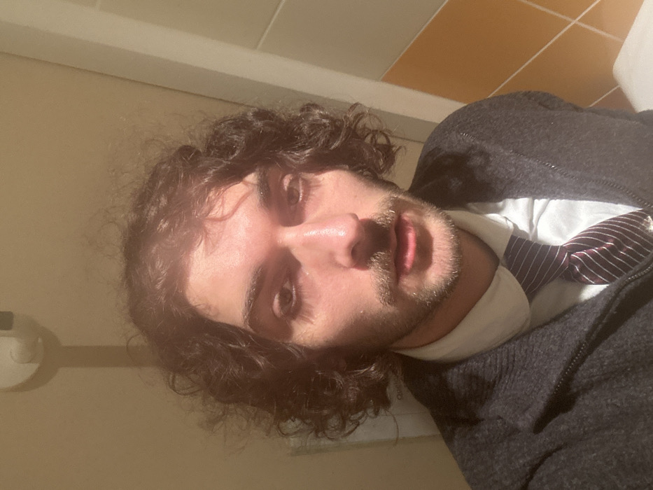 A male individual with dark, curly, shoulder-length hair, a mustache, and a beard is depicted in a close-up, front-facing selfie. He wears a white collared shirt, a dark striped tie, and a dark grey or black zippered cardigan/jacket. His eyes are open and directed towards the camera, and his face exhibits a somewhat shiny appearance, possibly due to lighting or perspiration. The background indicates an indoor location, likely a restroom in Chatou, France. The left side of the background features a plain light-colored wall with a white wall-mounted object, possibly a dispenser, casting a vertical shadow. The right side shows a tiled wall with orange or brown rectangular tiles and a partial view of a white porcelain fixture, consistent with a toilet or sink. Overhead lighting illuminates the scene directly.