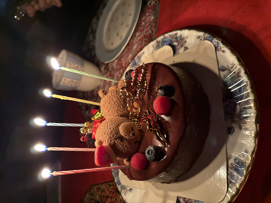 - "The image depicts a chocolate cake, centrally placed on a decorative white and blue floral plate with a gold rim, set atop a red textured tablecloth" by FM-IXb3V2, licensed under CC BY 4.0