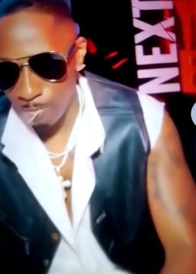 two people seated next to each other in what appears to be an entertainment setting. The man is wearing sunglasses, a white shirt with a black vest, and jewelry, and is holding a toothpick in his mouth. The woman has her hair up, is wearing a white top, and has a white handbag. The background includes signage that says "NEXTTIME FULL OF WITH YOUR". The woman touches her face in one segment of the video and then turns to the side, smiling. The atmosphere seems informal.