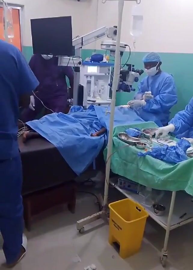 In a brightly lit, sterile operating room, three individuals, all clad in surgical scrubs and masks, attend to a patient covered in a blue surgical drape. A central figure, positioned behind a microscope, appears to be performing a surgical procedure. To the side, another person assists, while a third observes near a computer screen. An IV drip hangs from a stand, and surgical instruments are arranged on a nearby table draped in green. An infectious waste container sits on the floor.