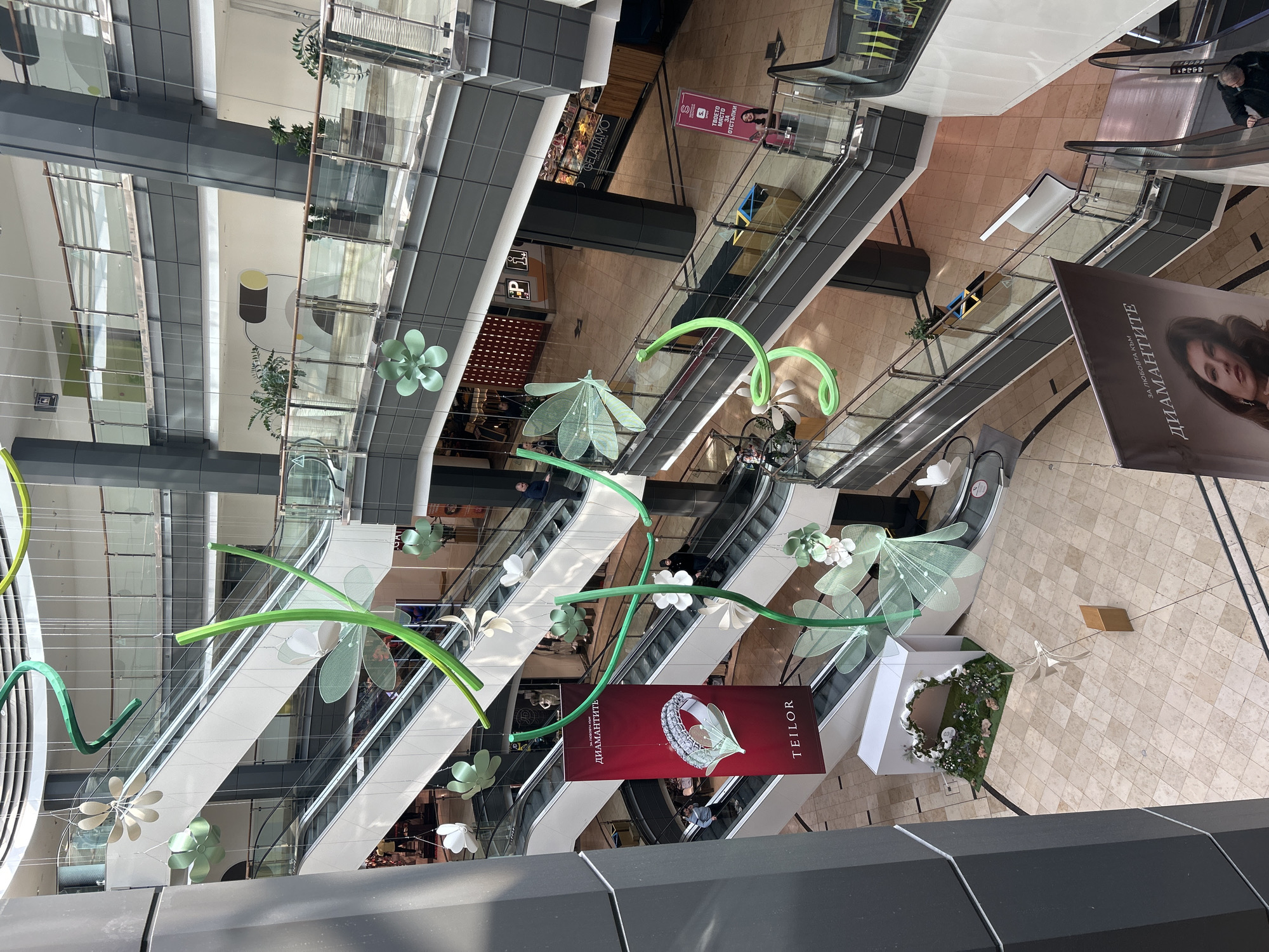 The image depicts a multi-level indoor shopping mall atrium, specifically Paradise Center in Sofia, Bulgaria. The scene is brightly lit, showcasing modern architecture with white and light-colored tiled flooring, dark grey structural columns and escalator surrounds, and extensive glass and metal balustrades on each floor. Multiple pairs of escalators ascend diagonally across the frame, connecting at least five visible levels. Numerous suspended decorative elements hang from the high ceiling, comprising light green tubular structures resembling vines and translucent, pale-colored shapes resembling flowers or large dragonfly wings, attached by thin wires. Several individuals are present, scattered across different levels and on the escalators, navigating the mall. One man in a dark jacket is ascending an escalator in the lower right. Another person is visible on an escalator near a prominent vertical banner. Advertising and store signage are visible: * A large red vertical banner on the left features a diamond ring, "ДИАМАНТИТЕ" (Diamonds), and "TEILOR" (a jewelry brand). * A partially visible brown-toned banner at the bottom right shows a woman's face and "ЗА ЛЮБОВТА КЪМ ДИАМАНТИТЕ" (For the love of diamonds). * A pink and white vertical banner with a woman's image and Bulgarian text is located near an escalator on a lower level. * The storefront for "GELATIAMO" (a gelato shop) is visible on a lower level. * An informational sign with "P i" (parking information) is mounted on a wall on an upper level. Faint signage for "JD" is visible on a distant storefront. On the ground floor, a small white arch-shaped display with artificial greenery and flowers is present. Potted plants adorn some upper-level walkways, and waste receptacles with blue and yellow compartments are visible on a lower floor. A small, light-colored wooden pedestal stands on the ground floor. No distinct interactions or specific actions beyond general movement are apparent among the individuals.