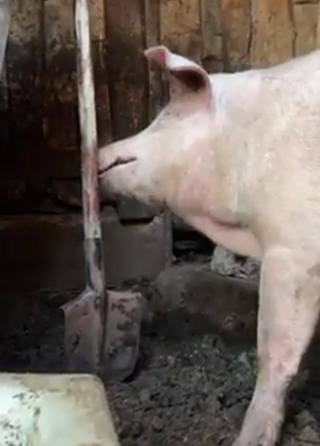 Inside a dimly lit, rustic enclosure with muddy ground, a large, light-colored pig stands near a shovel. The shovel leans against the wall. A person's hand and arm can be seen holding the shovel's handle. The pig curiously investigates the shovel with its snout. A trough-like object sits in the foreground. The walls appear to be constructed from wood.