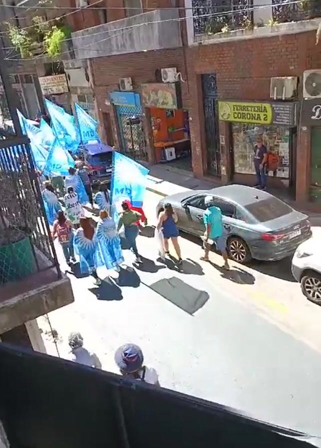 From an elevated viewpoint, a group of people march down a street. They are carrying light blue flags with the text "MDF" and the words "Patria Futura" on them. Some individuals are wearing capes that match the flag design. The street has parked cars on both sides and shops lining the sidewalks. People are walking on the sidewalks and entering and exiting the shops. The buildings are a mix of brick and painted facades. The weather appears sunny.