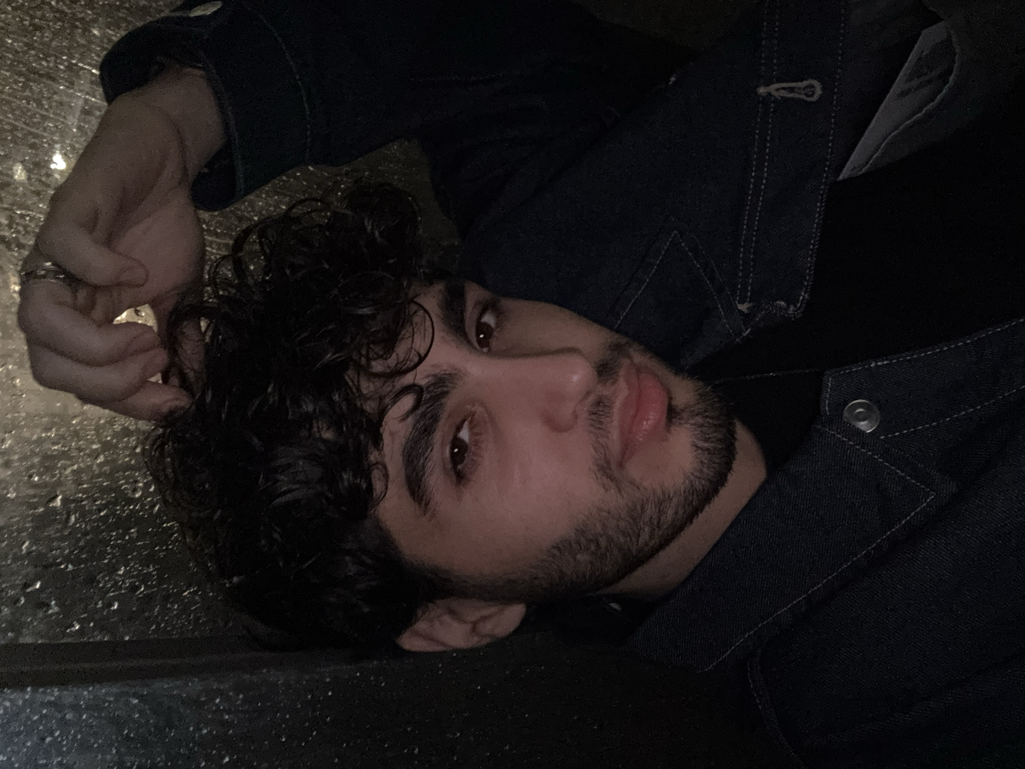 A low-angle close-up shot depicts a dark-haired man with curly hair and a beard. He is lying down, facing upwards with his head tilted. His right hand is raised, with fingers slightly curled. He wears a dark denim jacket with visible button details and stitching. The background appears to be a dark, possibly reflective surface. The location and the city Yerevan, Armenia are not discernible from the image.