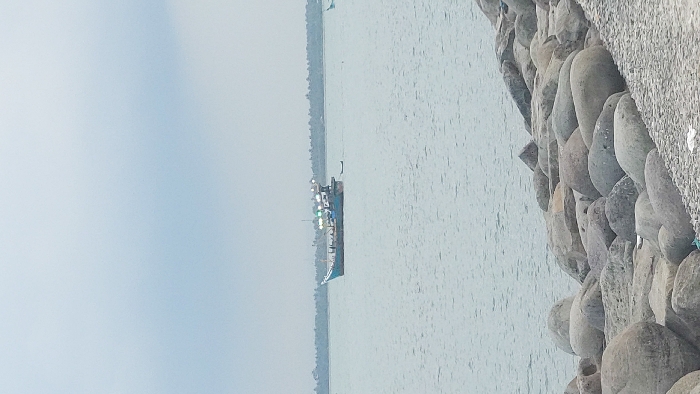 The image captures a coastal or estuarial environment under an overcast, pale blue-grey sky. In the foreground, a barrier of numerous rounded, grey boulders extends from left to right, with gravel and small white debris visible on the ground adjacent to the rocks on the right. The midground is dominated by a calm body of light grey-blue water. Positioned centrally in the water is a light blue fishing boat, approximately 15-20 meters in length, equipped with several illuminated green and white lights on its deck structure. Indistinct human figures are present on the boat's deck. A smaller, dark, canoe-like vessel trails to the right of the main boat. A third, lighter-colored boat is partially visible towards the right edge of the frame near the horizon. The background features a distant, narrow landmass covered in dense, dark green vegetation, likely palm trees, stretching across the horizon. The scene is located in the city of Unknown, Unknown.