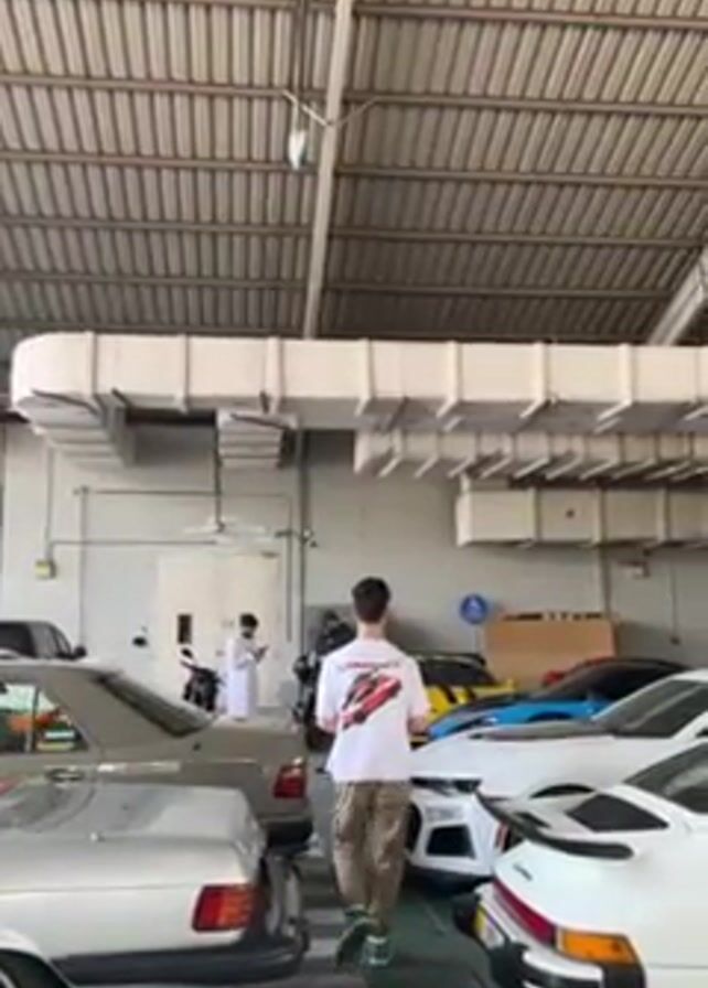 Inside a large garage with a corrugated metal ceiling and extensive overhead ductwork, a group of people is gathered among a collection of cars. Two men are visible walking on the left side of the frame, one closer to the camera wearing a black t-shirt with the number "3" visible. The second man walks away from the camera, wearing a white t-shirt with a colorful graphic and khaki pants, and green sneakers. He walks between a silver Mercedes-Benz and a white Porsche 911. Further along the line of cars, a yellow Chevrolet Camaro and a blue car can be seen. The camera pans to the right, revealing a purple Dodge Challenger and a white Acura Integra. Two men dressed in traditional Middle Eastern clothing stand in the background. A motorcycle is parked nearby. The environment suggests a car enthusiast gathering or perhaps a classic car dealership.