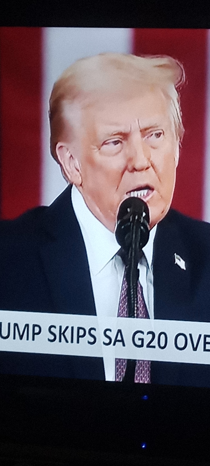 This image is a close-up, slightly blurry photograph of a television screen, captured in Abuja, Nigeria. The screen displays a male individual, identified as Donald Trump, shown from the chest up, positioned centrally. He is a Caucasian man with fair skin and styled, light-colored hair. He wears a dark suit, a white collared shirt, and a patterned tie, which appears to be a blend of purple/maroon and white. A small, white lapel pin is visible on his left lapel. His mouth is open, revealing a row of upper teeth, indicating he is speaking. A black microphone is directly in front of his mouth. The background behind him consists of vertical red and white stripes, consistent with the design elements of the American flag. Across the lower portion of the screen, a white news ticker or banner with black sans-serif text is visible, partially obscured. The legible text reads: "UMP SKIPS SA G20 OVE". The edges of the original photograph show dark, out-of-focus areas at the top and bottom, consistent with capturing a screen within a larger viewing environment.
