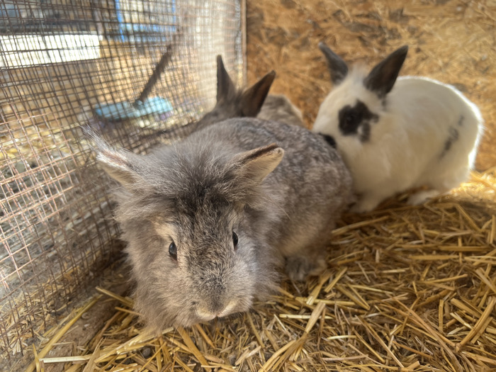 Three rabbits are observed within a wire mesh enclosure, identified as being located in Ashkelon, Israel. In the foreground, a grey, long-haired rabbit faces the viewer, its dark eyes visible. It rests on a thick layer of golden-yellow straw bedding that covers the enclosure floor. Immediately behind and slightly to the left of the prominent grey rabbit, a second grey-brown rabbit is partially visible. To the right of the foreground rabbit, a white rabbit with distinct black patches, notably a large patch covering its left eye and ear area, is oriented towards the background of the enclosure. The left side of the frame displays a section of a dark wire mesh fence. Through the mesh in the blurry background, a light blue object, consistent with a water bottle or feeder, is discernible against a lighter, undefined surface. The scene is illuminated by natural light from the right side.