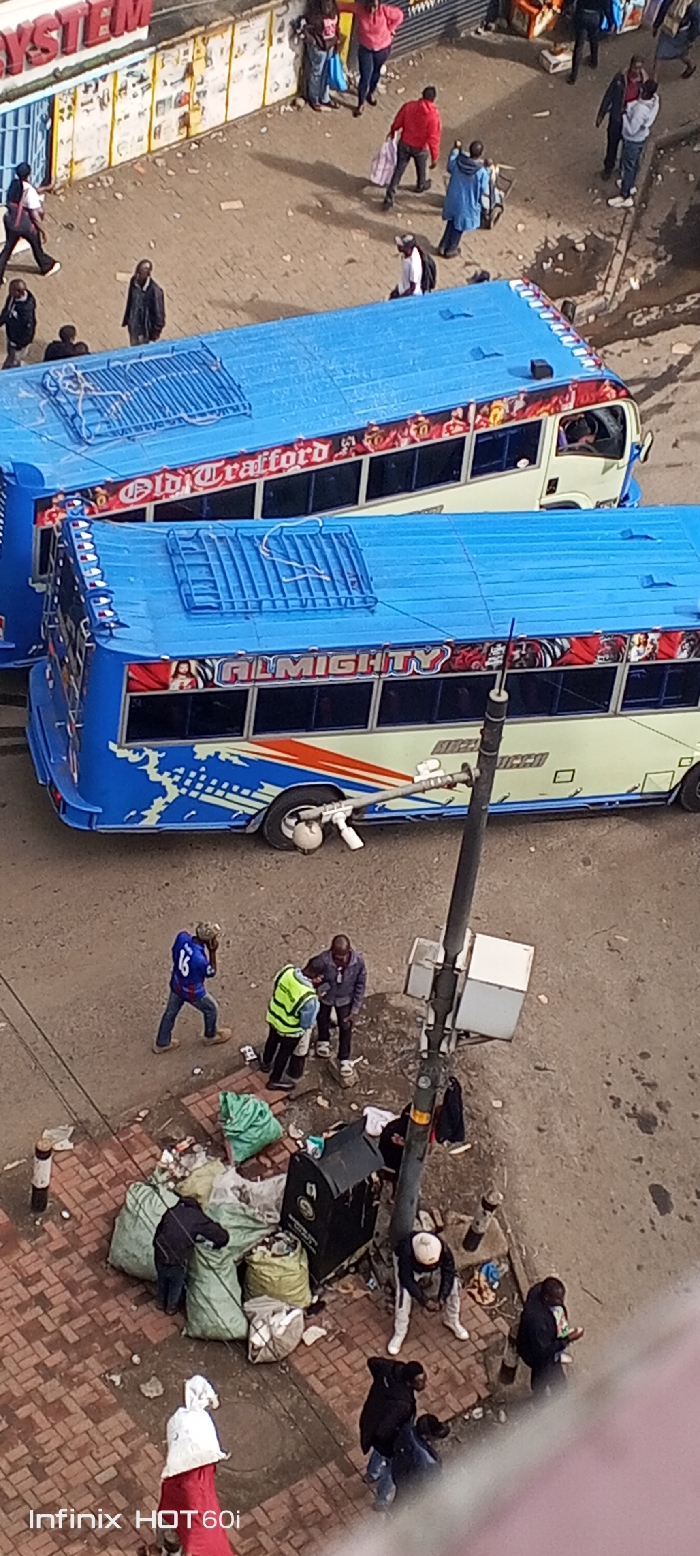 Two buses, one labeled "Old Trafford," the other "Almighty," sit parked on a street corner. Below, several people are gathered around piles of garbage bags and a black dumpster. One person wears a blue jersey, while another is in a bright yellow safety vest. The scene is captured from an elevated viewpoint, providing an overhead perspective of the street activity. Pedestrians walk along the sidewalk and across the street in the background.