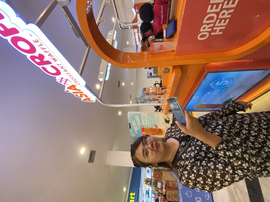 The image depicts an indoor scene within a shopping mall in Sidoarjo, Indonesia. The primary focus is an "ASIA CROP - CROISSANT WAFFLE" kiosk, characterized by its orange and red design with an illuminated overhead sign. Digital displays on the kiosk advertise "FRESH ICED TEA" for 5 units and "JASMINE TEA" with coconut jelly for 8,000 units. In the foreground left, a female individual with dark hair, glasses, and a dark floral long-sleeved dress holds a dark smartphone horizontally in her right hand, looking towards the camera. A dark cross-body bag is visible across her torso. Behind the kiosk counter, two female staff members wearing matching red shirts and dark head coverings are visible. One staff member is actively preparing an item. A blue payment terminal and several clear plastic cups are present on the kiosk counter. The background features typical mall elements including a white ceiling with recessed lighting, various retail displays, a partially visible "Hypermart" sign on the left, and a "Guardian" sign on the right, indicating a commercial shopping environment.