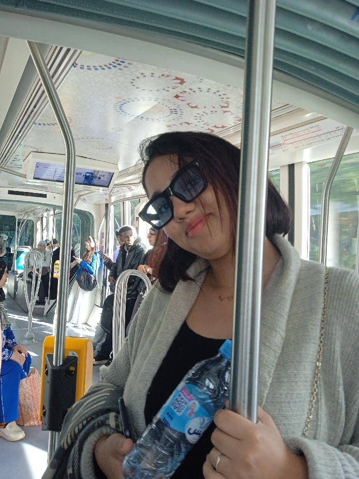 A woman with short dark hair and large sunglasses smiles at the camera while holding a water bottle. She is wearing a gray cardigan over a black top and a delicate gold necklace. She is standing on public transportation, possibly a tram or train. Other passengers are visible in the background. The interior of the vehicle is modern with overhead screens and patterned ceiling panels. A silver pole is in the foreground.