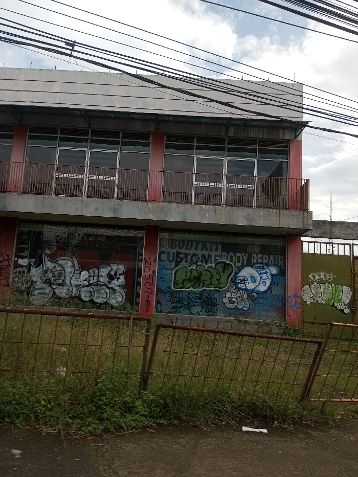 The image depicts a two-story building in Chagzam_Pam, Bhutan, viewed from the street level. The structure features a light grey facade with reddish-brown vertical elements. The upper floor has multiple large windows with dark glass, fronted by a reddish-brown metal railing balcony. A grey flat roof with a slight overhang is visible, above which numerous black utility wires stretch across a cloudy sky. The lower floor also consists of large windows, extensively covered in multi-colored graffiti. Prominent graffiti includes a grey cartoonish character on the left, green bubble letters (possibly "POSSY") and a blue character on the central windows, and green bubble letters on a green metal gate to the right of the building. Text on the lower windows also indicates "BODYKIT CUSTOM BODY REPAIR". In the foreground, a rusty, partially collapsed metal fence stands amidst overgrown grass and weeds. The immediate foreground shows dark asphalt or concrete with a piece of white litter. No individuals are present in the scene.