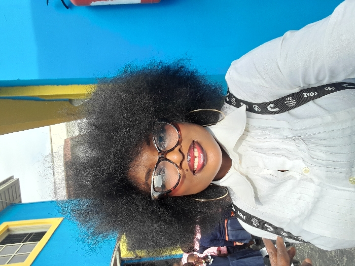A Black female adult is depicted in a close-up, chest-up portrait shot, positioned outdoors in Ajah, Nigeria