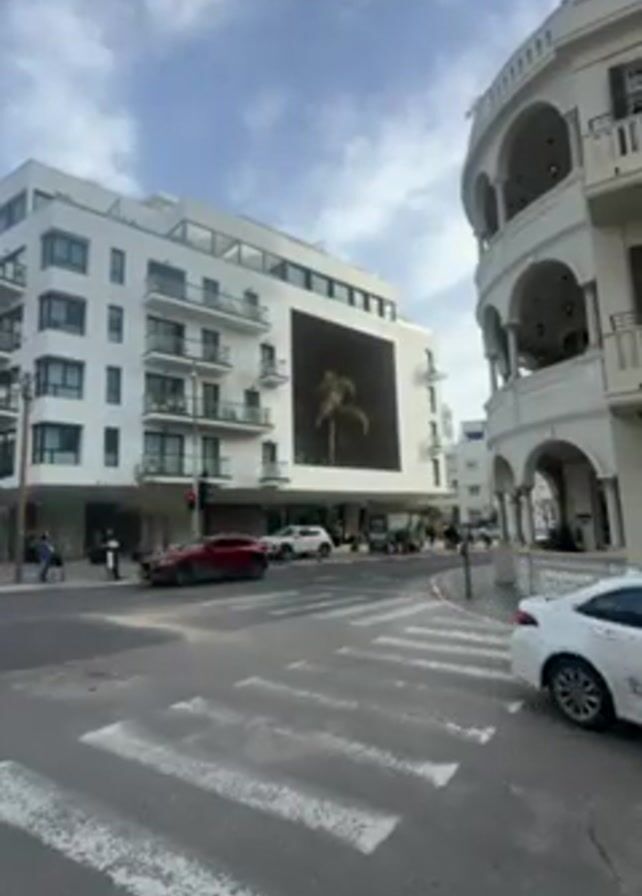 street scene with modern white buildings, one featuring a large screen displaying an image of a palm tree