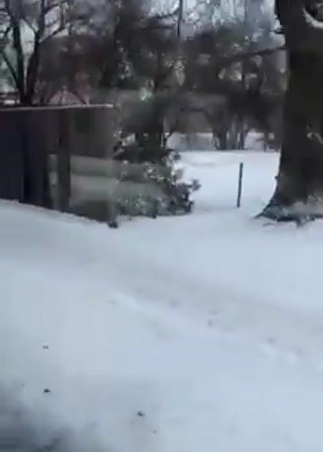 street view covered in snow. We see a wooden fence, trees, and a gas station in the distance. The camera seems to be moving, possibly from inside a vehicle. The overall impression is a cold, winter day in a snow-covered environment.