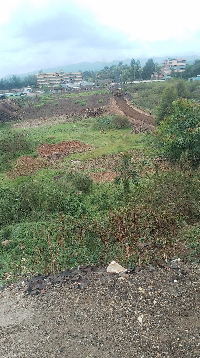 The image captures a developing, undulating landscape in Nkaimurunya ward, Kenya, under a cloudy sky. In the immediate foreground, rough gravelly earth is visible, scattered with dark, irregular debris and a white plastic bag. Directly beyond, dense green shrubbery and sparse trees dominate the lower-midground. The midground opens to disturbed terrain featuring patches of green grass, mounds of reddish-brown soil, and a newly cut dirt road. A yellow bulldozer, positioned on this road, faces away from the viewer. Several individuals are present on and near the road; at least two are wearing high-visibility vests. In the background, multiple multi-story buildings with orange and beige facades are visible on elevated ground, interspersed with numerous trees. Distant hills are silhouetted against the hazy sky.