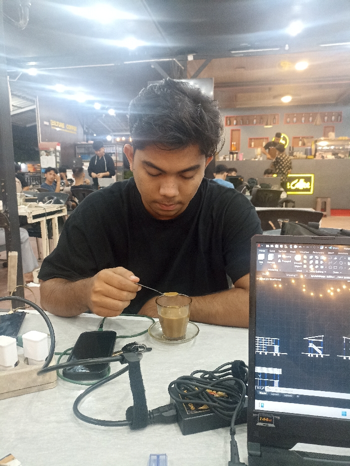 The image captures a young male seated at a white table inside "Culture Coffee," located in Lhokseumawe, Indonesia. The subject, an individual with dark hair wearing a black t-shirt, is positioned centrally, looking down. His right hand holds a small spoon within a clear glass containing a light brown beverage, resting on a clear saucer. On the table, to his left, is a black smartphone, face-down, alongside a power strip containing two white power adapters, and a black power brick with coiled cables. A black laptop is positioned to the subject's right, displaying CAD software with architectural or engineering schematics on its screen. In the background, other patrons are visible at tables, and a coffee preparation counter is discernible, featuring a barista and a neon "Coffee" sign. The environment is illuminated by bright overhead artificial lighting and decorative string lights.