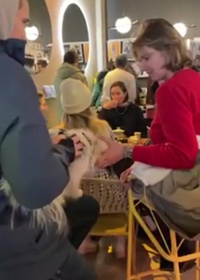 bustling scene inside a modern café. Several people are seated at tables, eating and talking. One person wearing a red sweater sits on a yellow bar stool near the camera. Another person in a blue jacket pets a small white dog held by a seated individual wearing a light-colored beanie and a plaid jacket. In the background, a foosball table can be seen with people gathered around it. The café has a trendy décor with round mirrors and contemporary lighting. The atmosphere appears lively and social.