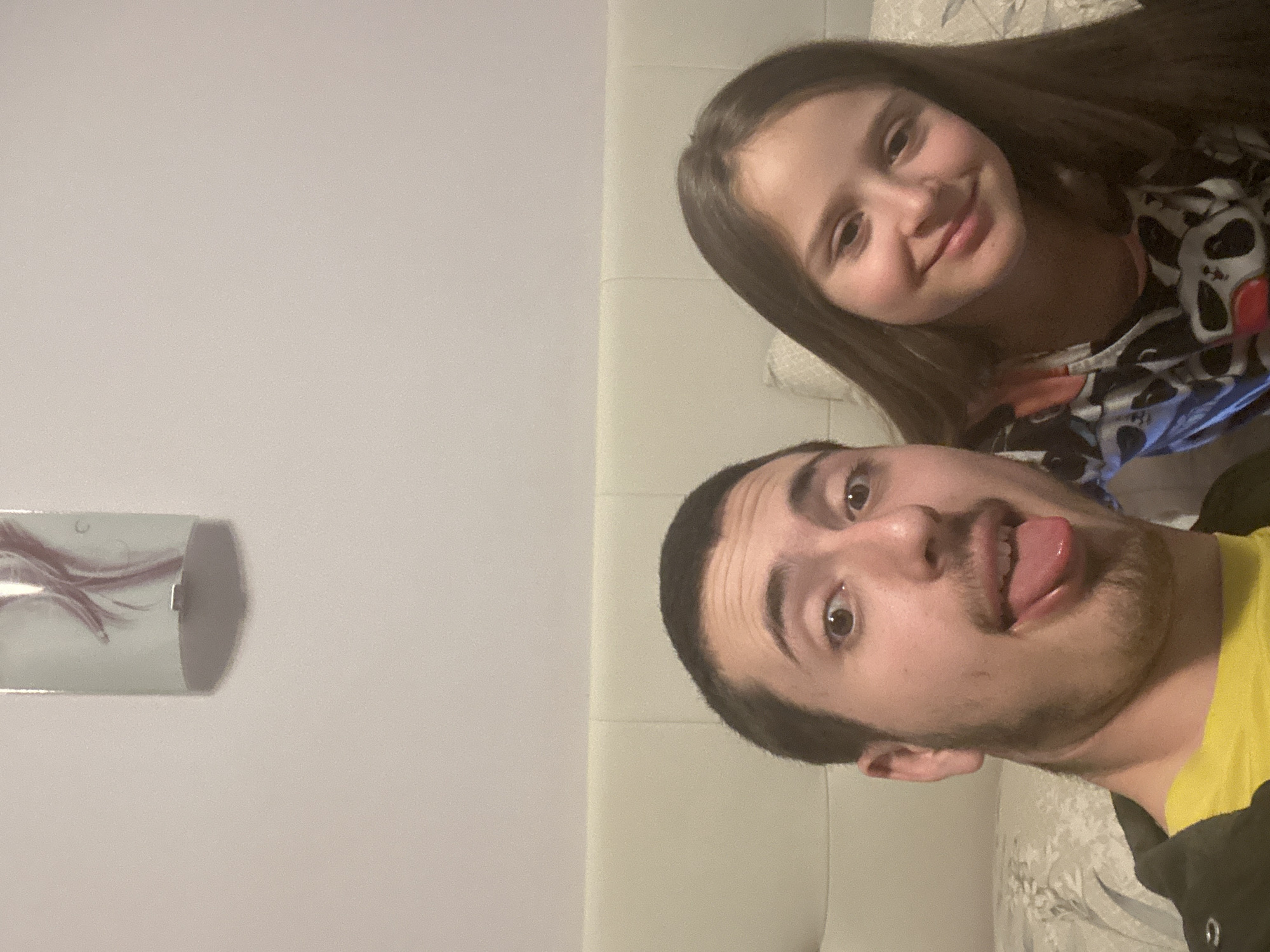 A selfie taken indoors shows a fair-skinned adult male with short, dark hair, a mustache, and a beard, sticking his tongue out. To his upper left is a fair-skinned girl with long, brown hair and a slight smile. They are in what appears to be a bedroom with a headboard behind them. The wall to the left is light colored and has a cylindrical object attached to it. The specific location in Burgas, Bulgaria cannot be determined from this single image.