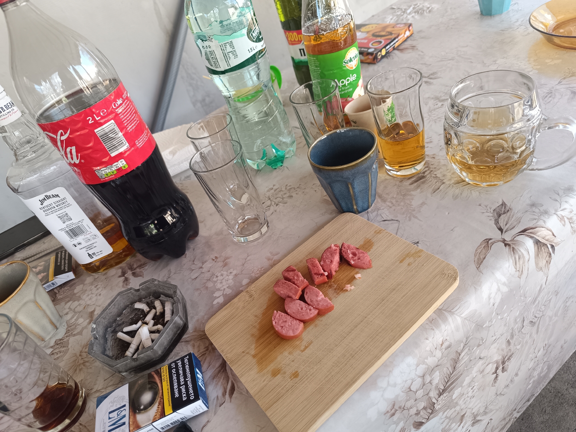 The image captures a casual, cluttered scene, likely outdoors, given the natural lighting. The main focus is a table covered with a floral-patterned tablecloth. On the table, there is an assortment of alcoholic and non-alcoholic beverages, including a bottle of Jim Beam bourbon, a 2-liter bottle of Coca-Cola, a bottle of mineral water, and a bottle of apple juice. These are accompanied by several glasses, some empty and some containing liquid. A beer stein is also present, filled with a pale liquid, presumably beer. In the center of the frame, a small wooden cutting board holds sliced sausages. Near the edge of the table, there is an ashtray filled with cigarette butts, along with a pack of L&M cigarettes. The scene suggests a gathering or a casual meal. The cigarette pack has text in Bulgarian, as well as the Coca Cola bottle, which is labeled as being 2 liters. Based on this information, the location is likely Stamboliyski, Bulgaria.