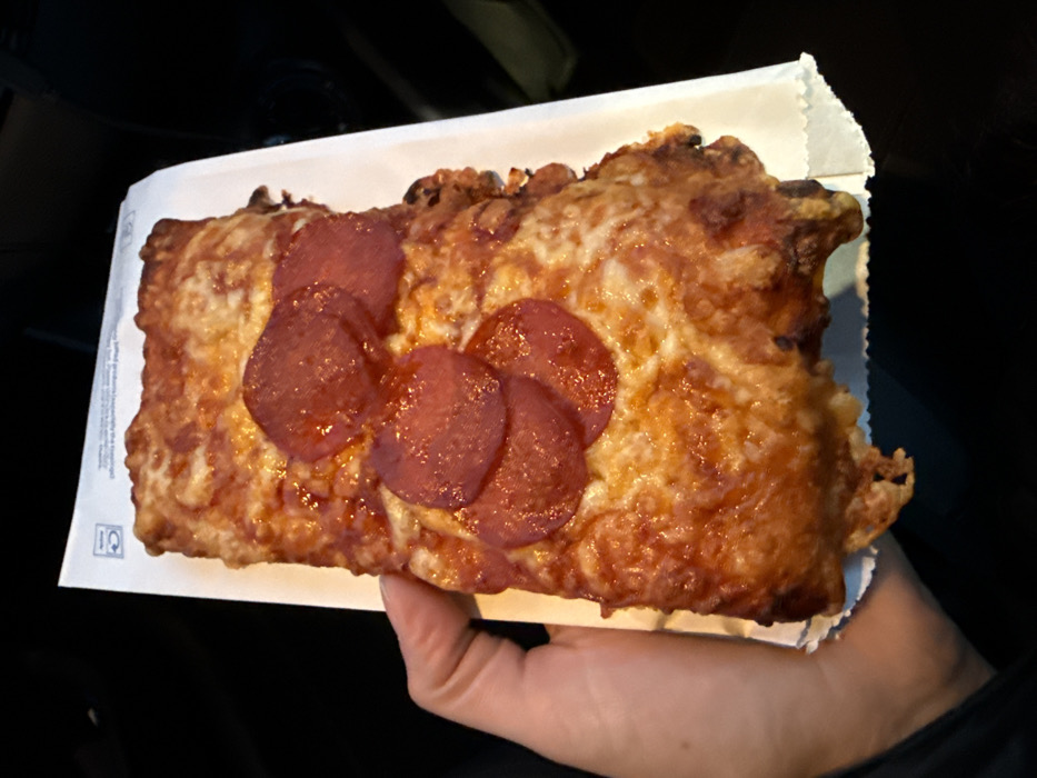 A single, rectangular slice of pizza, approximately 10-12 inches in length, is held by a human left hand. The pizza features a thick, golden-brown crust, a melted cheese layer with areas of light brown caramelization, and approximately nine circular slices of pepperoni. The pepperoni slices are reddish-orange, slightly cupped, and exhibit a greasy sheen. The pizza rests on a white, grease-resistant paper sheet, approximately 12 inches long, with scalloped edges along its visible bottom and right sides. A blue recycling symbol is printed on the upper left corner of the paper. The hand, exhibiting light skin tone, supports the pizza and paper from the lower-left underside. The background is dark, out-of-focus, and devoid of specific features, suggesting an indoor or vehicle interior environment. No specific location within Gorleston-on-Sea, United Kingdom, is identifiable from the image. No other individuals or objects are clearly visible.