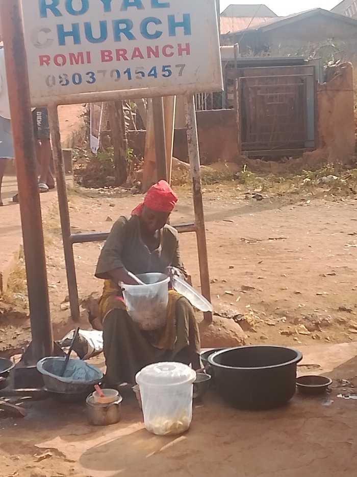 - "An outdoor scene in Yelwa, Nigeria, captures a woman seated on dry, unpaved ground, situated beneath a metal frame holding a white sign for "ROYAL CHURCH ROMI BRANCH" with the number "08037015457"" by FM-I1js82, licensed under CC BY 4.0