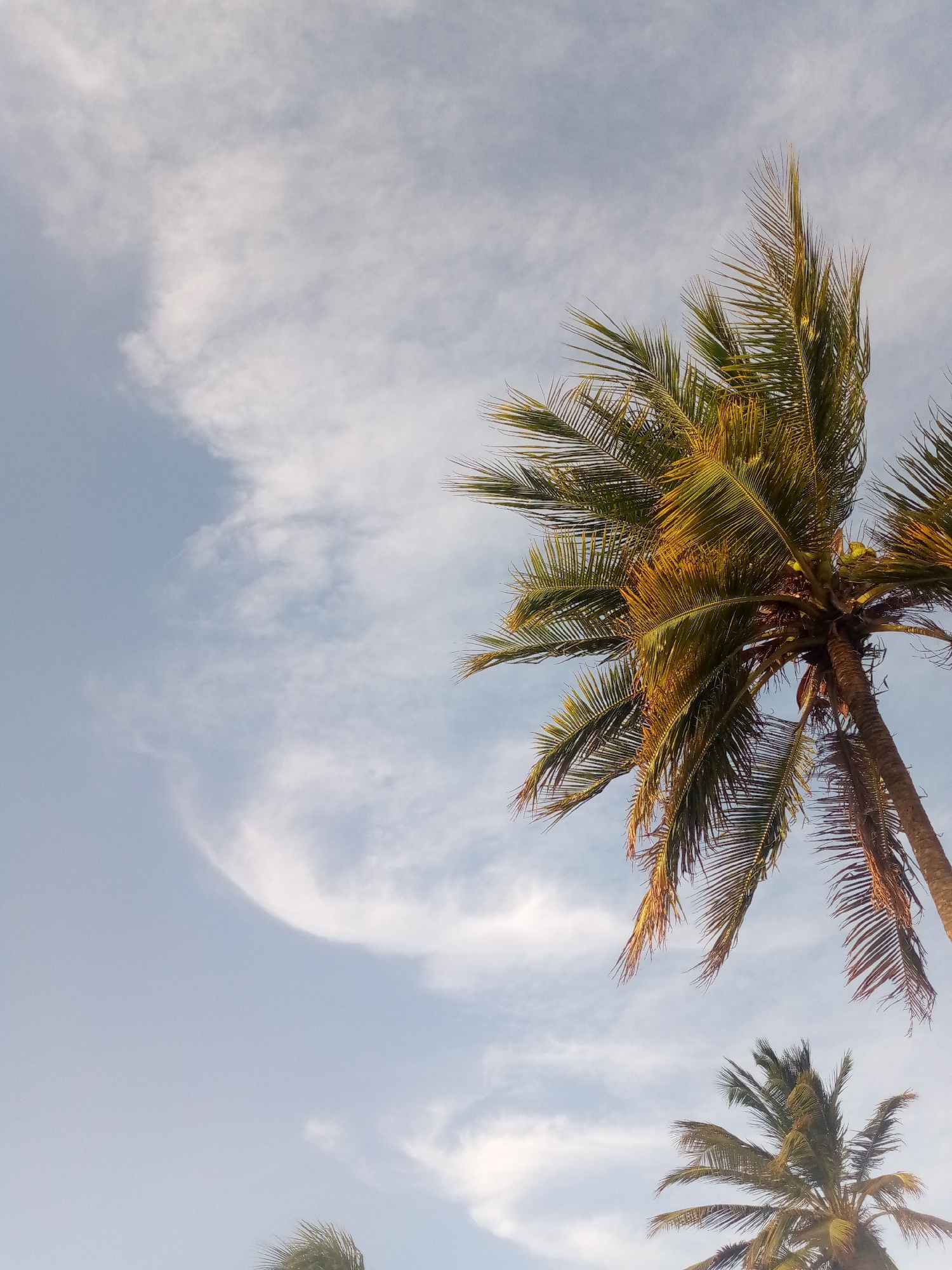 The image depicts a low-angle view of palm trees against a partly cloudy, pale blue sky. The predominant palm tree is centrally located and stretches upwards, its fronds detailed with a golden-green hue, possibly due to the angle of the sunlight. A wispy, semi-circular cloud formation is visible in the upper left of the frame. Partial views of other palm trees appear in the lower frame, adding to the tropical feel of the image. This scene is indicative of a coastal environment, aligning with the expected landscape of Juan Griego, Venezuela.