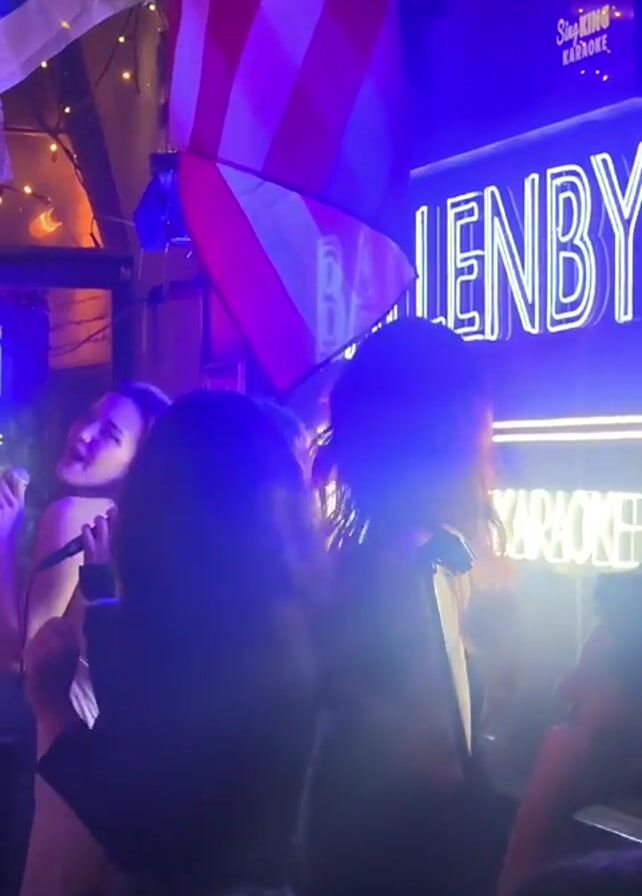 The video captures a group of people enjoying karaoke in a bar. Three women are visible in the foreground, two of whom are holding microphones and singing. The woman on the left is wearing a light-colored dress, while the other two are in darker clothing. They appear to be in the midst of a lively performance, with the woman on the left gesturing with her hand as she sings. In the background, a neon sign spelling "BALLENBY KARAOKE" is illuminated in bright blue. Flags hang above the group, along with string lights. There are also hints of other patrons and glasses in the shot, suggesting a bustling atmosphere.