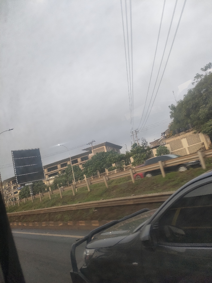 The image captures an overcast daytime scene in Gatongora ward, Kenya, observed from within a vehicle. In the immediate foreground, the front-right portion of a dark-colored vehicle, featuring a bull bar, is partially visible. A multi-lane roadway extends from the lower-left, bordered by a concrete barrier that separates it from a grassy median. A metal guardrail runs horizontally across the midground. Beyond this guardrail, a row of green trees partially obscures multiple structures. A prominent multi-story building with a light-colored facade and a dark roof is centrally located behind the foliage. To the left of this building, a large, dark, blank billboard stands near a street light pole. Two additional vehicles, a red car and a darker sedan, are partially visible on a road or parking area behind the guardrail. The sky is uniformly gray and overcast, with several parallel power lines traversing the upper frame from left to right, supported by a visible utility pole on the right. No human figures are discernible.