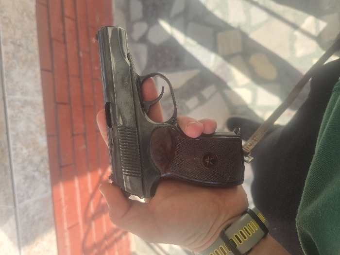 A right hand is gripping a dark-colored pistol, identified as a Makarov PM due to its distinctive form and dark grip panels bearing a star emblem