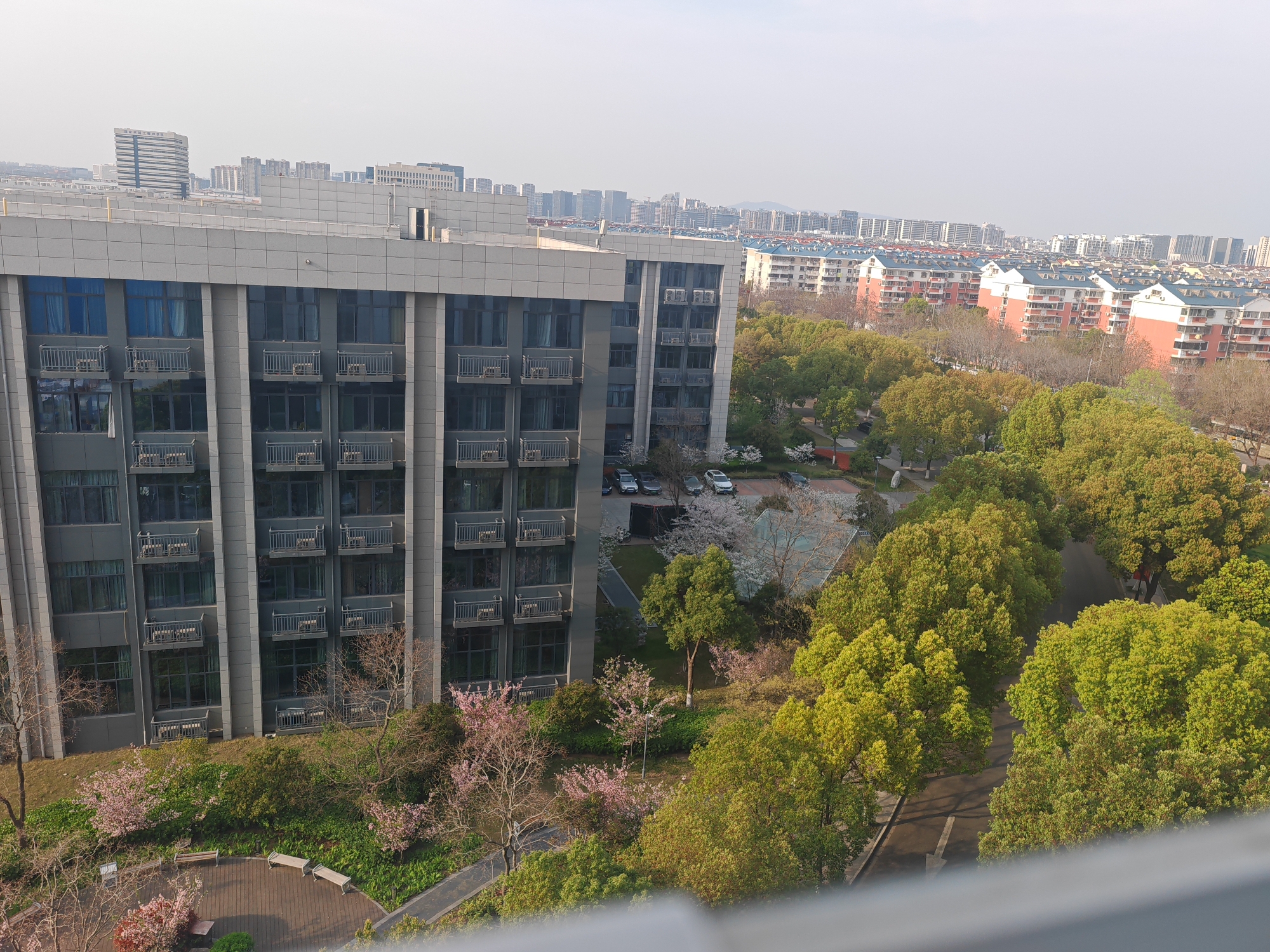 This photograph, taken from an elevated vantage point, depicts a cityscape within the Jiangning District of Nanjing, China. The foreground is dominated by a modern, multi-story building with a gray facade and rows of balconies. Adjacent to this building is a landscaped area featuring trees, some in bloom with pink flowers, benches, and paved walkways. A parking lot with several cars is also visible. In the background, a dense urban environment stretches towards the horizon, characterized by numerous mid-rise residential buildings with red roofs and a collection of taller structures. The sky is overcast, suggesting hazy atmospheric conditions.