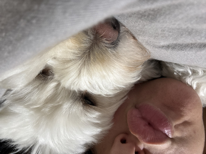 A close-up captures a serene moment between a dog and a person. A fluffy, white dog rests its head near a person's face. The dog's pink nose and partially closed eyes suggest relaxation. The person's lips are pursed as their face nestles against the dog. The scene is bathed in soft light with a blanket draped overhead, creating a cozy and intimate composition.