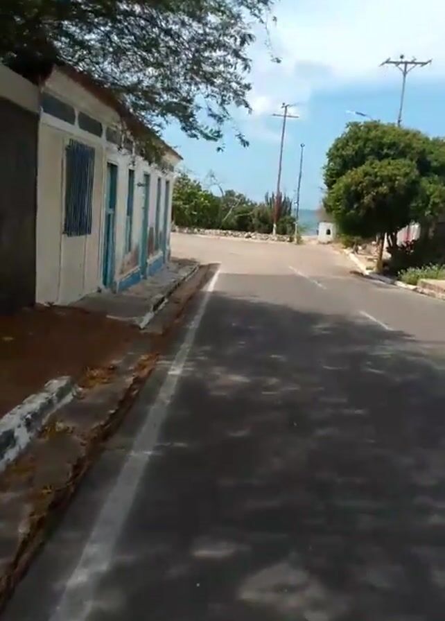 The camera moves down a narrow, paved street flanked by low buildings with weathered white walls and blue trim