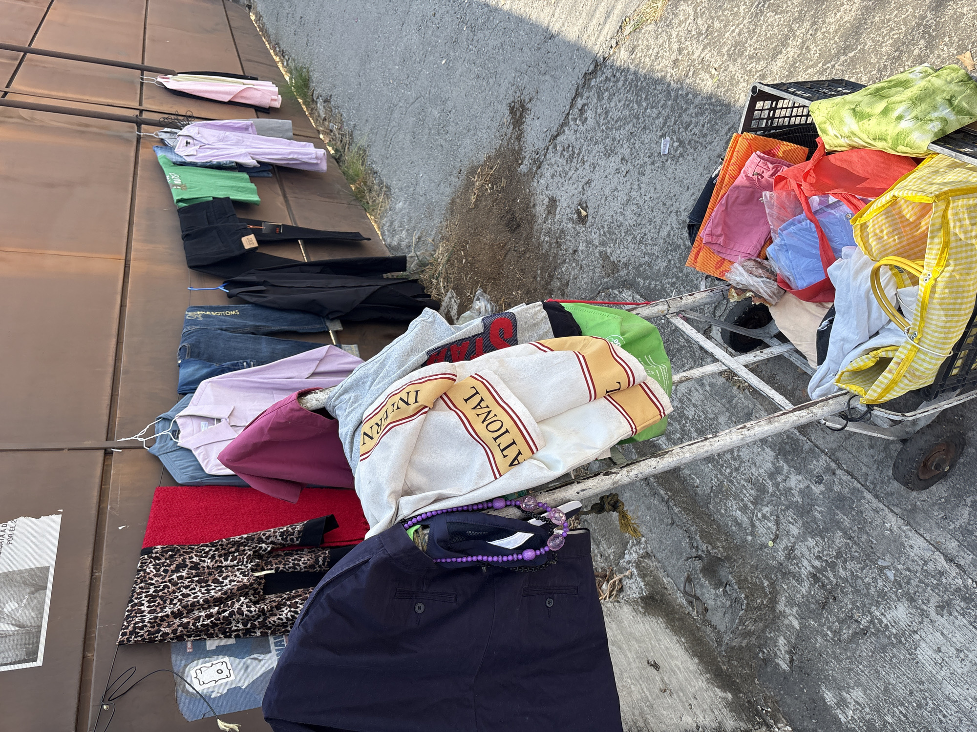 The image depicts an outdoor commercial setup against a plain, panelized wall in Cuernavaca, Mexico. A horizontal clothesline is strung across the mid-section of a tall, brownish-bronze wall, from which various items of apparel are suspended on hangers and draped. These items include a dark blue garment, a leopard-print blouse, a solid red fabric, light blue denim shirts and jeans, a light purple button-down shirt, a dark long-sleeved shirt, black trousers with a visible tag, a green t-shirt, a purple long-sleeved jumpsuit, a grey t-shirt, and a pink long-sleeved shirt. The wall itself is constructed of vertical panels, showing seams. A partial, faded black-and-white poster featuring a male figure and Spanish text ("POR EL") is affixed to the upper left. Below it, a torn blue paper with a white outlined figure is visible. In the foreground, a white, metal-framed, two-wheeled cart serves as a display. Folded clothing is piled on its upper frame, including a prominent cream-colored garment with "INTERNATIONAL" text in red and gold stripes. A dark purple beaded necklace is draped over a dark blue garment on the cart. The lower part of the cart holds a black plastic crate filled with additional merchandise, including multiple colorful fabric bags (yellow and white checkered, red, orange, green tie-dye), folded pink shorts, and a light blue shirt encased in plastic packaging. The ground consists of rough, gray concrete pavement, exhibiting cracks, dirt, scattered dry leaves, and small pieces of litter. A dark, damp-looking stain is present on the pavement near the base of the wall. Natural daylight illuminates the scene, casting shadows from the clothing and cart onto the ground. No individuals are visible.