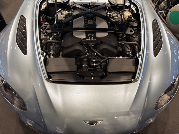- "An overhead forensic view captures the front section of a light blue metallic Aston Martin sports car with its hood open, revealing a V12 5" by FM-ZwJu93, licensed under CC BY 4.0