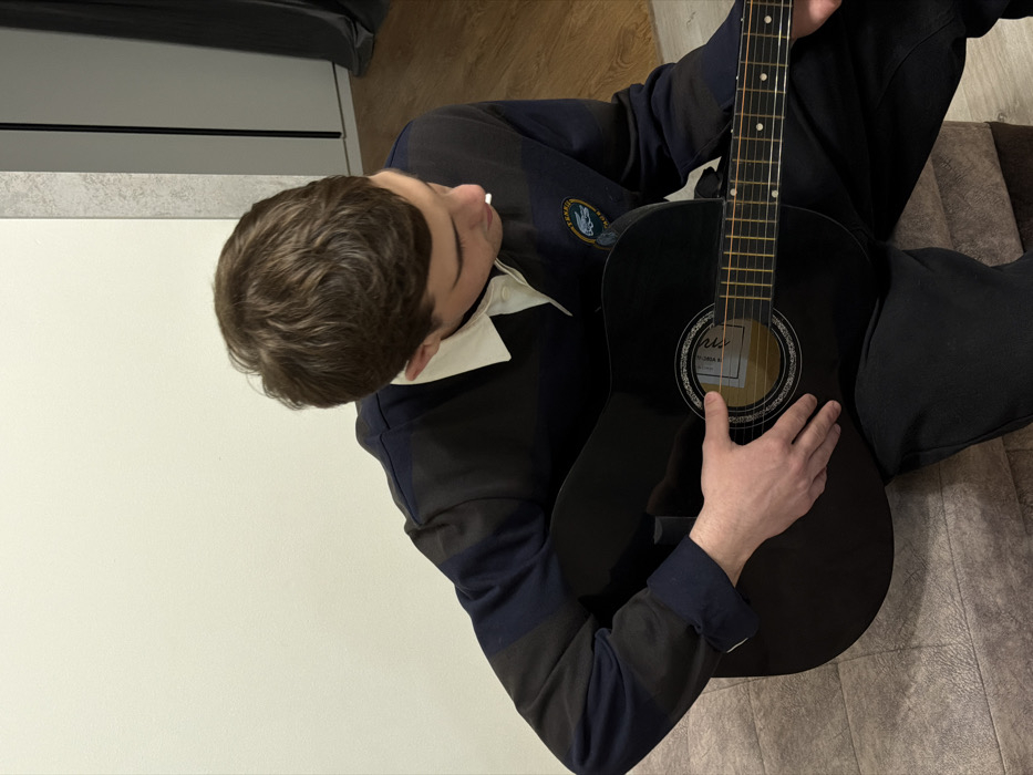 - "A young male individual, estimated to be in his late teens or early twenties, with short, wavy brown hair, is seated and engaged in playing a black acoustic guitar" by FM-t12ef2, licensed under CC BY 4.0
