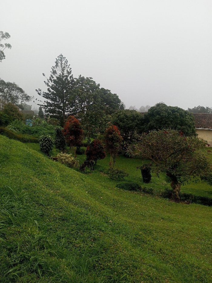 The image displays a verdant, sloped landscape within Irupalai, Sri Lanka, under an overcast sky. The foreground is dominated by a lush green grassy hill, sloping upwards from the lower left. The midground features a diverse array of vegetation, including multiple trees with dark green canopies, several smaller trees exhibiting reddish-brown foliage, and various conical or spiky shrubs. A gnarled tree trunk is visible on the far right of the midground. In the background, a dense tree line is present, with a tall, slender conifer-like tree prominent in the upper left-center. A light-colored building with a reddish-brown tiled roof is partially visible on the far right background, while a light blue structure, possibly a tank, is partially obscured by foliage on the far left. The upper portion of the scene is filled with a uniform light gray, hazy sky, indicating mist or heavy cloud cover. No persons or animals are present.
