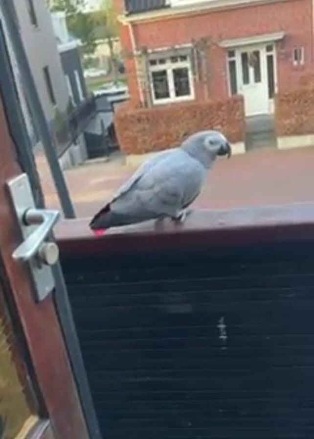 A medium shot shows a gray parrot with a red tail perched on a dark ledge