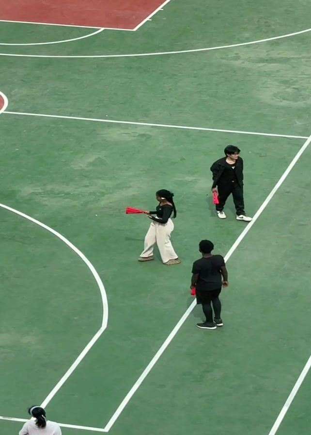 A high-angle shot shows three people on a green and red basketball court, each holding a red fan. One person, wearing a black top and white pants, practices fan movements. Another individual in all black stands still, holding their fan. A third person, dressed in black, stands with their back to the camera, also holding a fan. White lines mark the court's boundaries, and the overall scene appears to be a rehearsal or practice session.