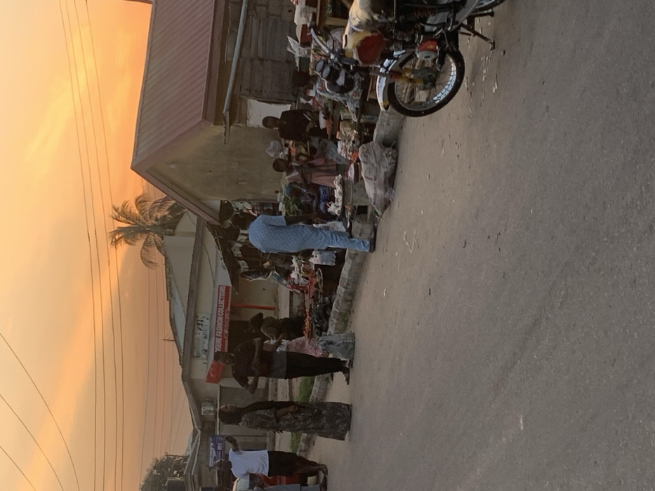 The image captures a street scene in Lokoja, Nigeria, under the warm, orange light of either dawn or dusk