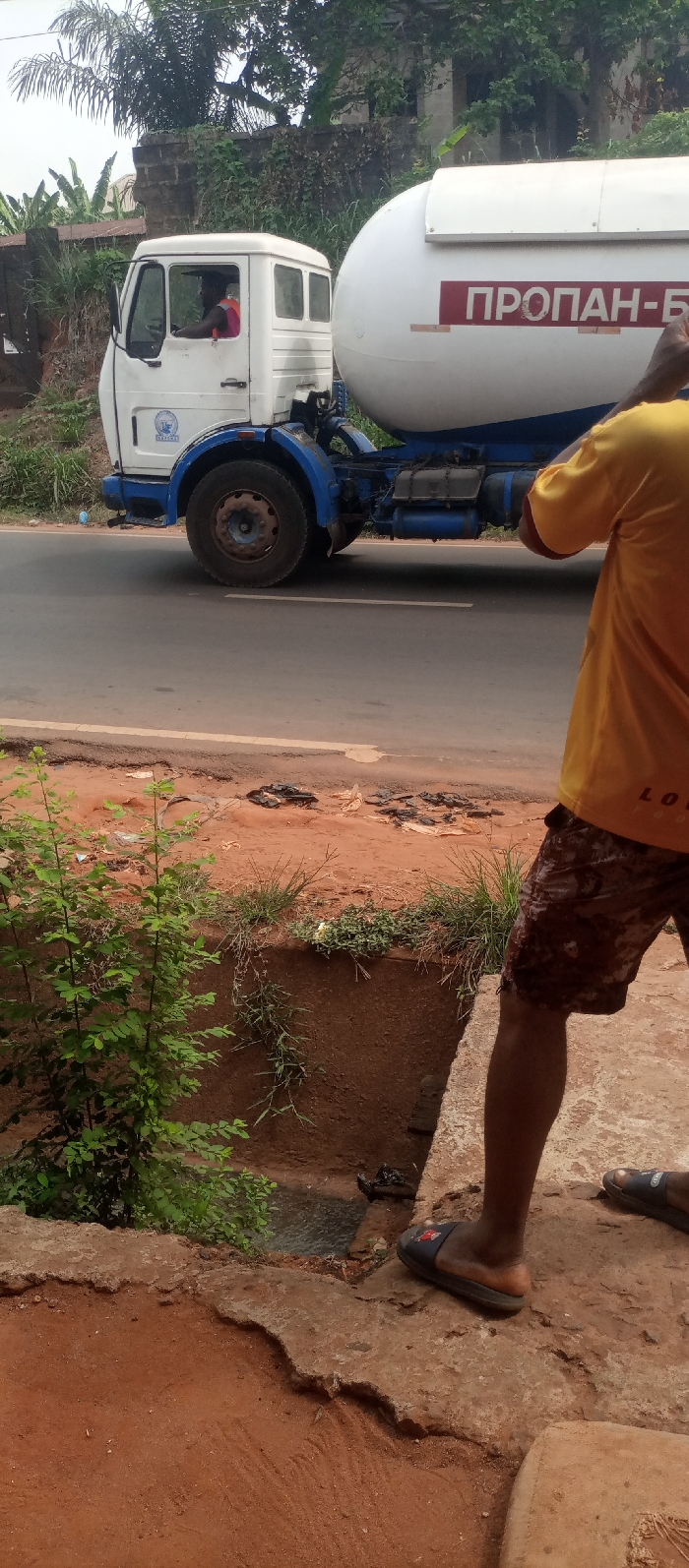 The image depicts a roadside scene in Ogidi, Nigeria. A white tanker truck with a blue chassis and fenders is parked or moving slowly on an asphalt road, occupying the middle ground. The truck's white tank bears the Cyrillic inscription "ПРОПАН-Б", indicating propane-butane. A blue circular logo is visible on the cab door. A male driver, wearing an orange/red short-sleeved shirt, is visible through the open driver's side window. In the immediate foreground, on the right, the lower torso and legs of an individual are visible, wearing a yellow short-sleeved shirt, brown camouflage-patterned shorts, and dark blue flip-flops. This individual stands on a concrete edge bordering a concrete-lined ditch containing dark liquid and debris. The unpaved area between the ditch and the road consists of reddish-brown soil, scattered with black plastic bags and other refuse. Green vegetation, including small leafy plants and grass, grows from the soil and hangs into the ditch. In the background, beyond the truck, dense green foliage, trees, a stone wall partially covered in vines, and a light-colored building are visible. The asphalt road surface shows wear, with a faded white edge line.