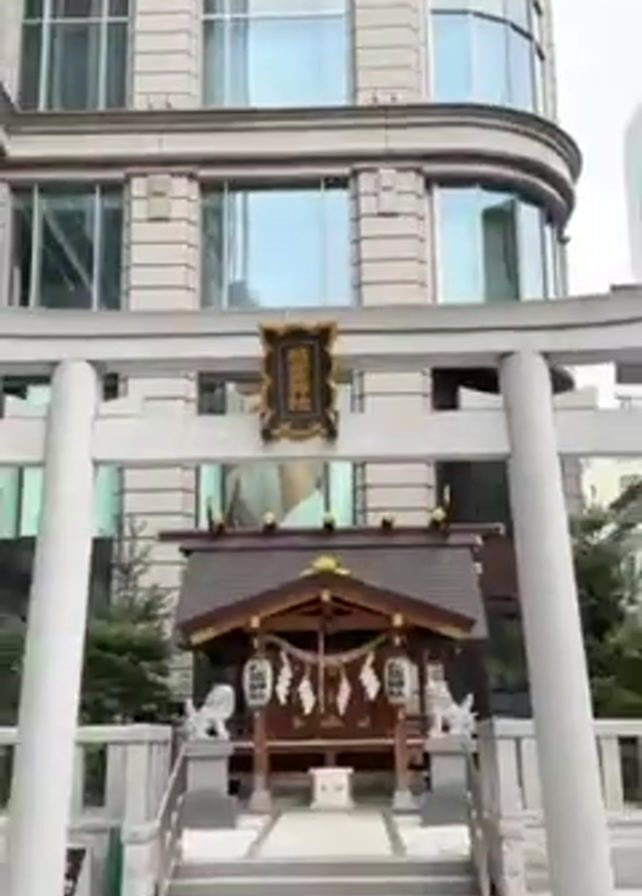 Japanese shrine. It starts with a close-up of a sign in Japanese that says "Akiba Shrine". Then the camera zooms out to show the shrine, which is a small building with a torii gate in front of it. The shrine is located in an urban area, with tall buildings in the background.