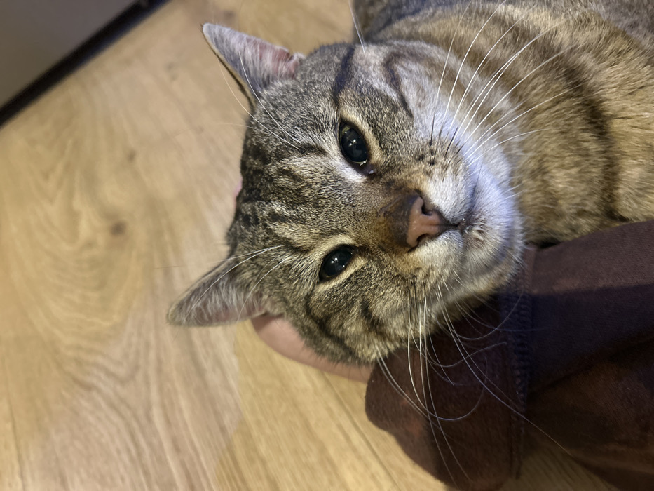 - "A domestic cat, exhibiting a brown and black tabby coat pattern with prominent whiskers, is depicted in a close-up, high-angle shot" by FM-qtGFX2, licensed under CC BY 4.0