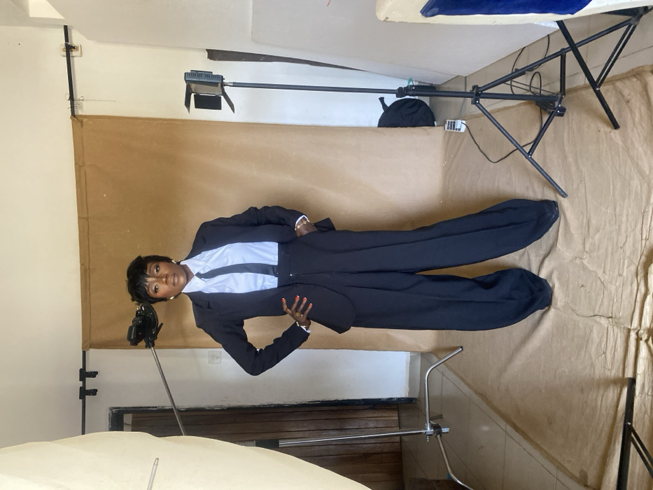 This image depicts a studio photoshoot in Jos, Nigeria, featuring a dark-skinned adult female subject