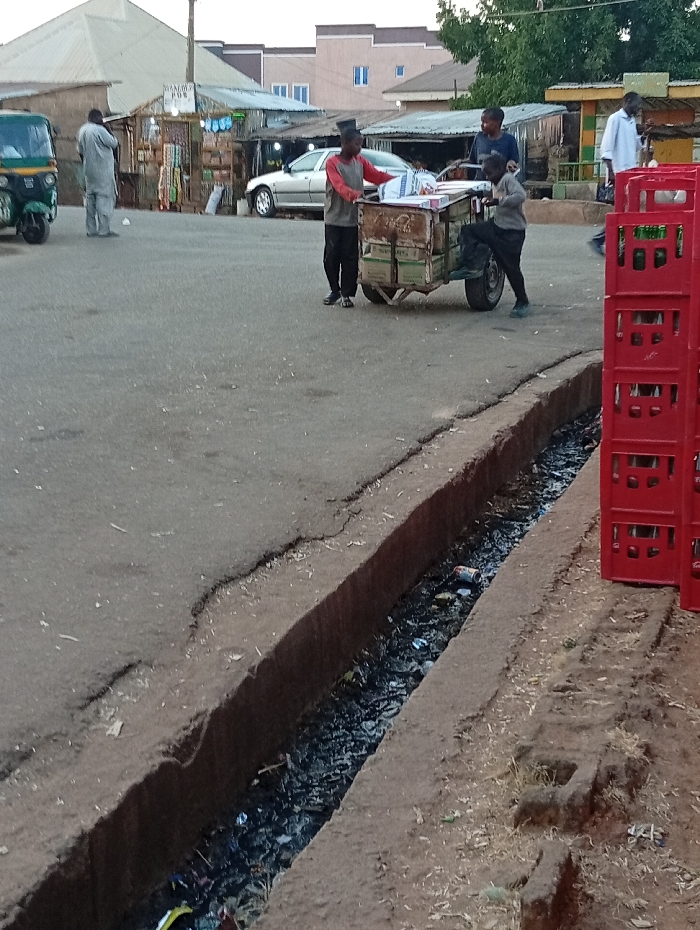 Three young individuals navigate a street with a cart loaded with goods. One pushes, another rides, and a third stands nearby. A drainage ditch runs along the street's edge, filled with debris. Red crates are stacked next to the ditch. A car, auto rickshaw, and pedestrians populate the street scene. Buildings and shops line the background under an overcast sky.