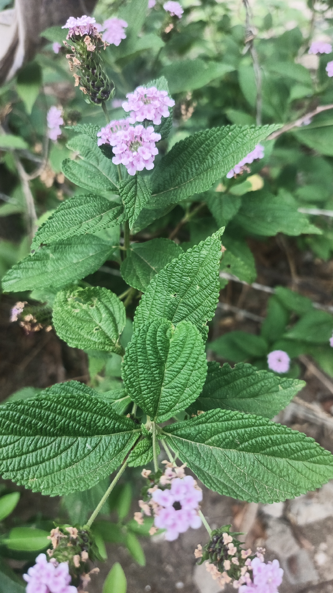 close-up view of a lantana plant with green leaves and clusters of small, light purple flowers